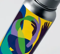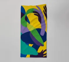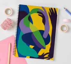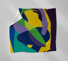 Una composizione astratta con forme fluide e intrecciate nei toni del blu, del giallo, del verde e del viola, che suggeriscono un abbraccio o un gioco dinamico di forme.