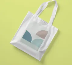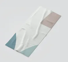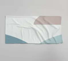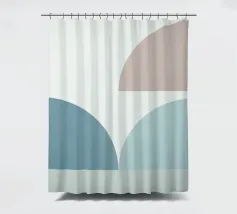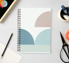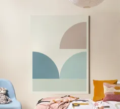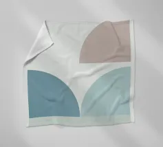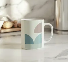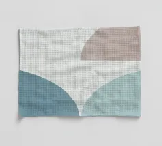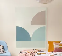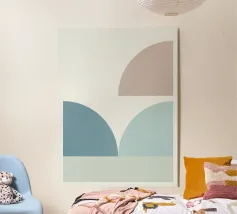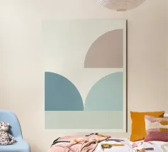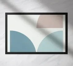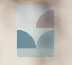 Forme geometriche in tenui colori pastello sono disposte in uno stile minimalista, caratterizzato da semicerchi con varie tonalità di blu e di marrone. La composizione crea un senso di equilibrio e semplicità su uno sfondo chiaro.