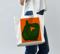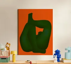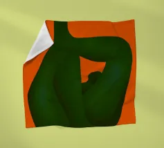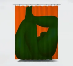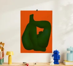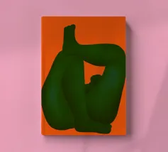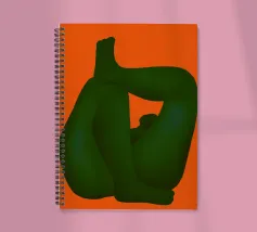 La silhouette di una figura seduta è rappresentata in verde scuro su uno sfondo arancione, creando un forte contrasto. La figura sembra essere in posizione ripiegata, enfatizzando il gioco di luci e ombre.