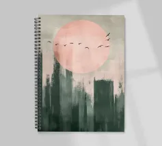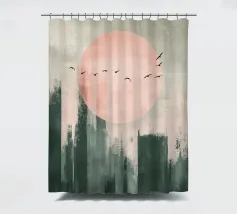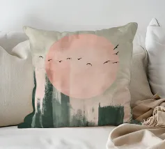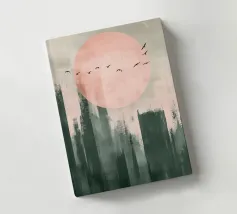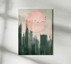 Questo disegno minimalista mostra un dolce sole all'orizzonte mentre uccelli neri volano nel cielo. I toni caldi del verde salvia e del rosa pastello si armonizzano perfettamente e creano un'atmosfera calma e senza tempo che aggiunge eleganza a qualsiasi ambiente. Ideale per l'arte naturalistica moderna!