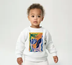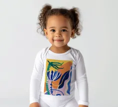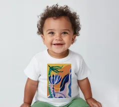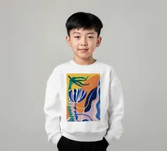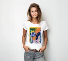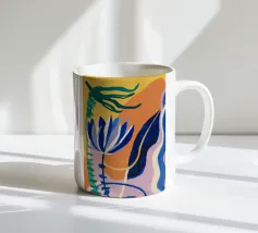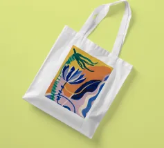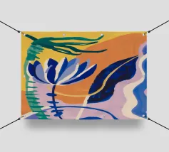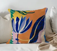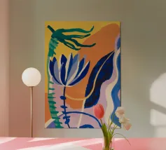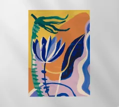 Composizione astratta con forme organiche e vegetali in blu, arancio e giallo su uno sfondo strutturato, che suggerisce una composizione botanica stilizzata.
