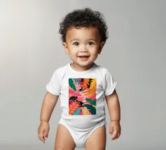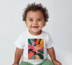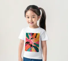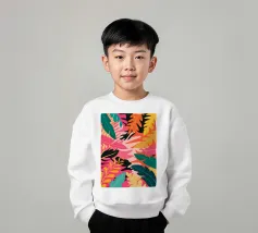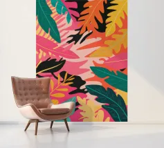 Una composizione audace e astratta di foglie e forme tropicali sovradimensionate in rosa, arancione, verde e giallo vivaci, che creano un'atmosfera dinamica ed energica di giungla.