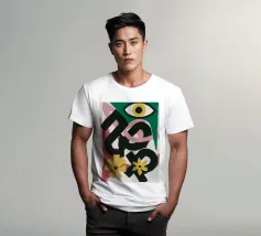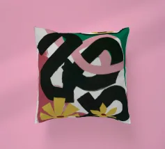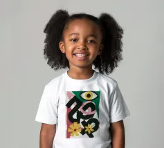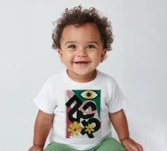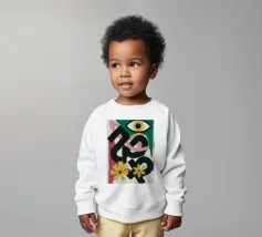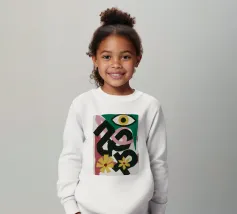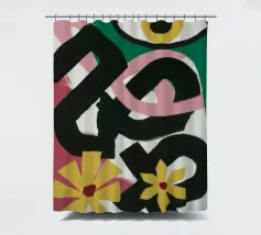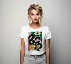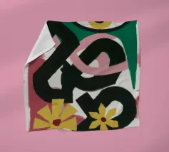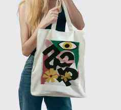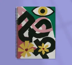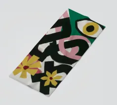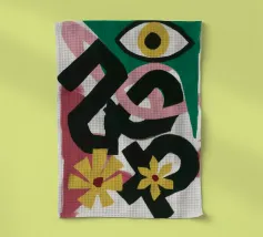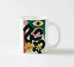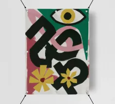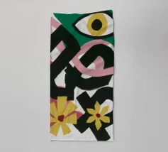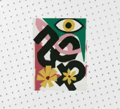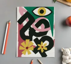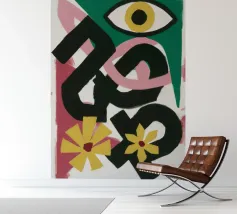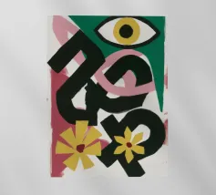 Una disposizione caotica e gioiosa di forme astratte, tra cui un occhio, fiori e forme geometriche, crea un'atmosfera carnevalesca con un tocco dinamico e moderno.