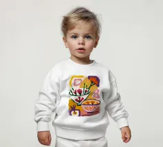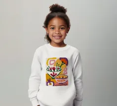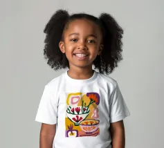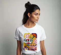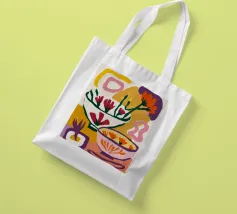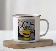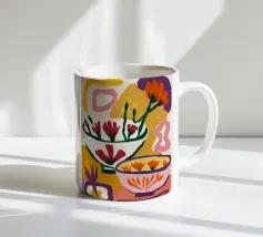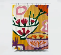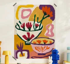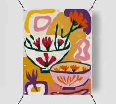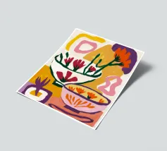 Un'opera floreale astratta audace e grafica. Fiori e foglie stilizzati in una ciotola sono rappresentati con forti contorni e aree piatte di colore, creando un'opera d'arte dinamica, moderna e altamente decorativa.
