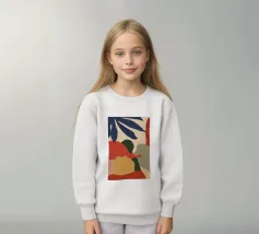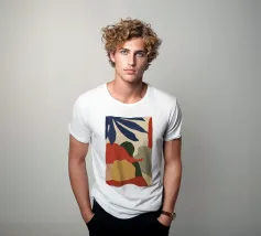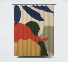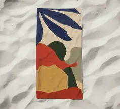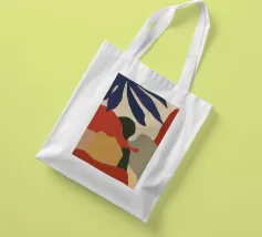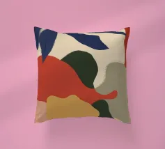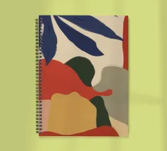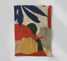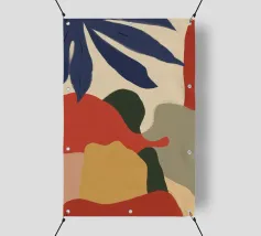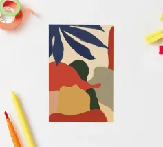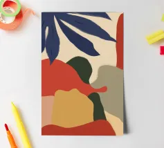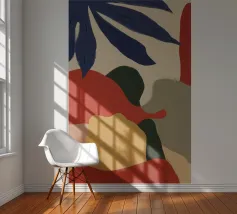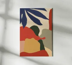 Una composizione astratta di forme di foglie e piante in una calda tavolozza di rosso, ocra e blu scuro su uno sfondo neutro. Lo stile è moderno e ispirato a Maraoui.