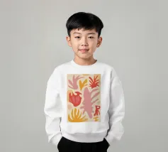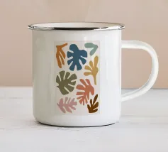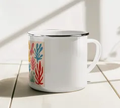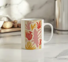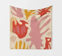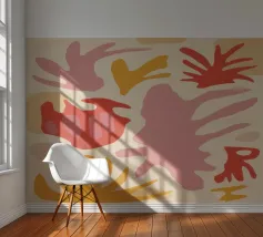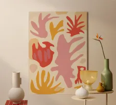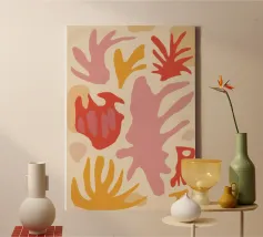 Una composizione giocosa di forme astratte e organiche nello stile di Maraoui, che utilizza una tavolozza calda di rosa, rosso e giallo su uno sfondo beige.