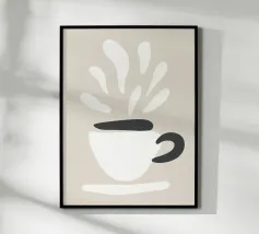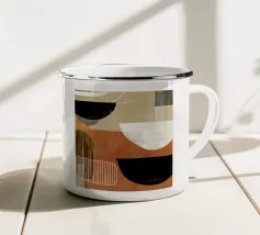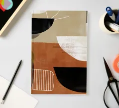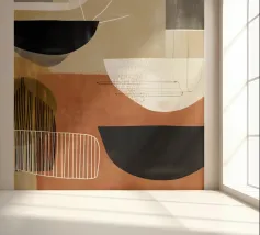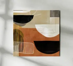 Arte di ispirazione retrò con forme sovrapposte in arancione, bianco e nero. Il design ha una qualità senza tempo che si adatta perfettamente agli interni di metà secolo, alle case scandinave o agli spazi eclettici con un tocco nostalgico.
