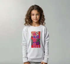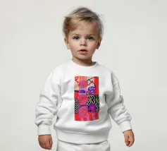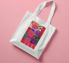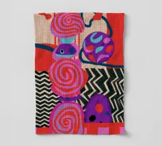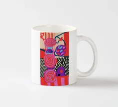 Una dinamica composizione astratta presenta forme, spirali e motivi audaci e ritmici in una vibrante tavolozza di rossi, rosa, blu e nero, creando un'opera energica e visivamente stimolante.