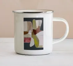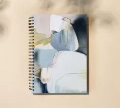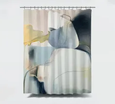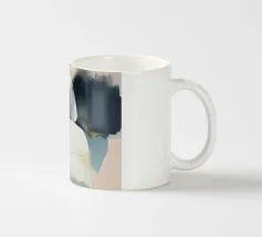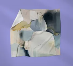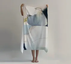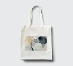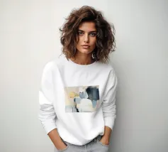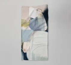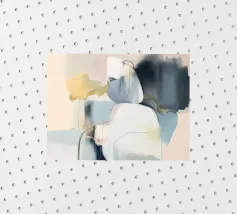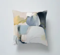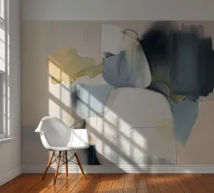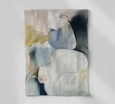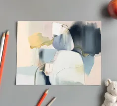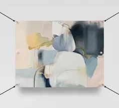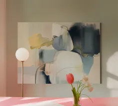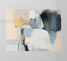 Un dipinto astratto leggero e arioso con forme morbide ed effimere simili a nuvole nei bianchi, nei gialli pallidi e nei blu tenui, che si fondono delicatamente e suggeriscono un paesaggio celeste fugace e onirico. Stile Melissa Herrington.