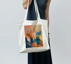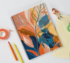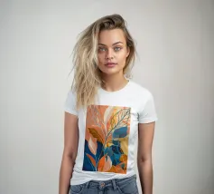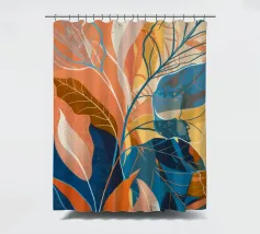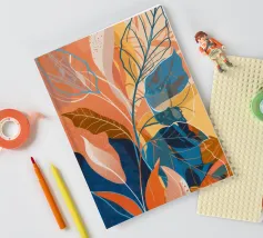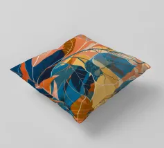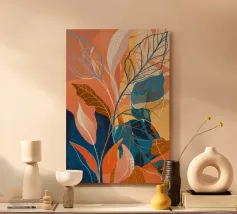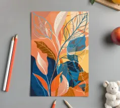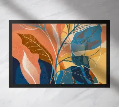 Una rappresentazione astratta di foglie e forme floreali sovradimensionate in una calda tavolozza di arancioni, blu e verdi, con un'attenzione particolare alle forme e ai modelli audaci.