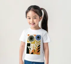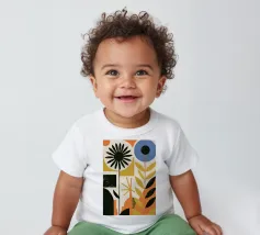 Una composizione astratta con fiori stilizzati e forme geometriche in una tavolozza di nero, giallo, bianco e arancione tenue. La composizione crea un'atmosfera botanica moderna e sofisticata.