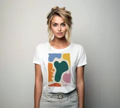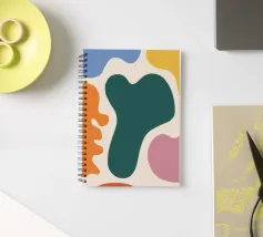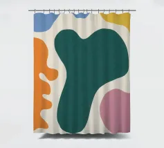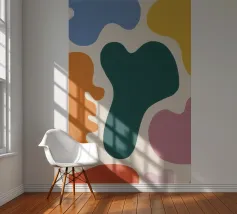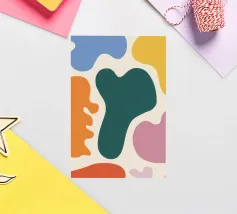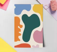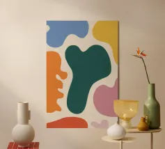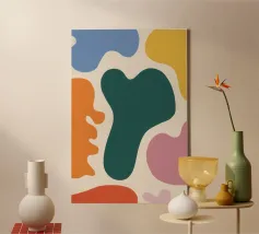 Un'opera d'arte astratta minimalista ed elegante, caratterizzata da una composizione di forme organiche e morbide. La tavolozza di colori tenui, blu, verde e terracotta, crea un'atmosfera rilassante e terrosa che ricorda le forme naturali.