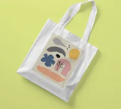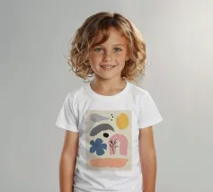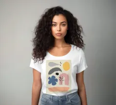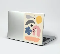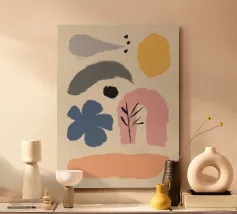 Un'opera d'arte astratta minimalista che presenta un insieme di forme fluide e organiche in una tavolozza di colori terrosi come terracotta, beige, nero e giallo.