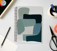 Forme astratte e sovrapposte nei toni tenui del verde, del blu e del grigio creano una composizione armoniosa. Il design si concentra su forme morbide e organiche che contrastano tra loro per formare una visione equilibrata.