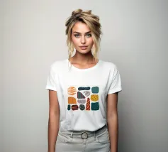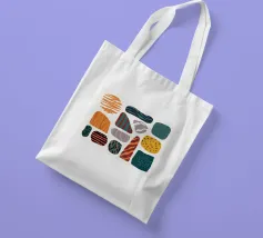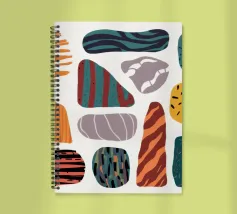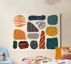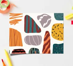 Una collezione di forme astratte, organiche e simili a pietre è presentata con varie texture e motivi, in una palette di colori terrosi come l'arancione, il verde acqua e il beige, creando una composizione moderna e tattile.