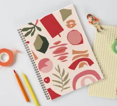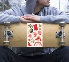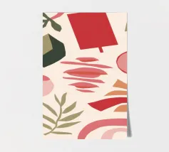 Una composizione astratta di forme decostruite, tra cui foglie, archi e forme geometriche, disposte in una tavolozza di colori equilibrata e terrosa di terracotta, rosa e verde.