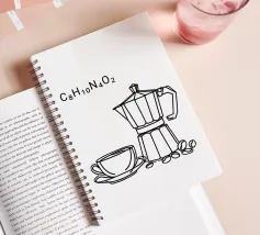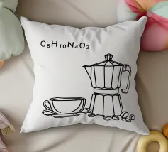 Questo poster line art minimalista mostra la pura essenza della vita - sotto forma di una classica moka, una tazza di caffè caldo e la formula chimica della caffeina: C₈H₁₀N₄O₂.