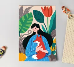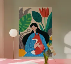 Una donna abbraccia dolcemente una volpe rossa, con il volto nascosto nella sua pelliccia, creando una scena tenera e magica di connessione tra un essere umano e un animale selvatico.