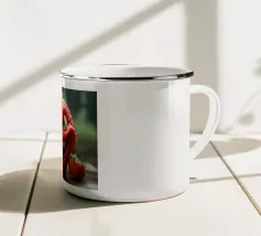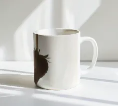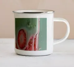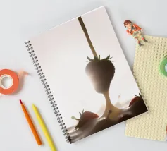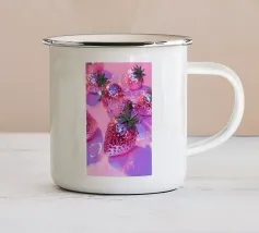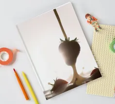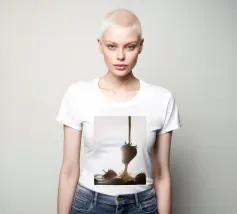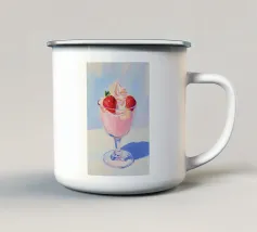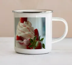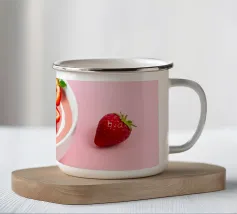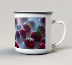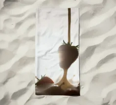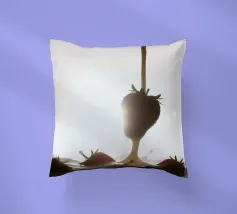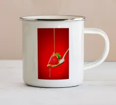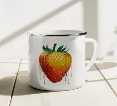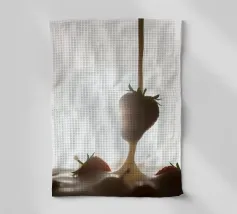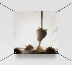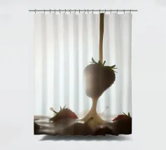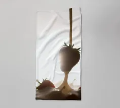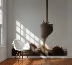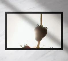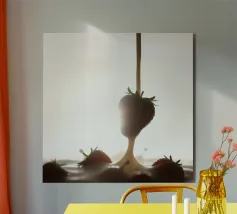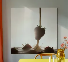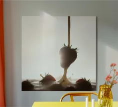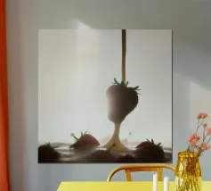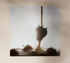 Le fragole sono ricoperte da una salsa deliziosa, che crea schizzi mentre cadono in una vasca di cremosa bontà. La luce intensa esalta l'atmosfera indulgente della degustazione del dessert.