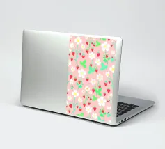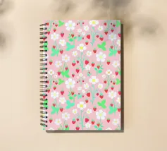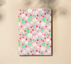 Splendida stampa floreale con fragole selvatiche rosse, fiori bianchi, steli e foglie verdi, su uno sfondo rosa pastello.