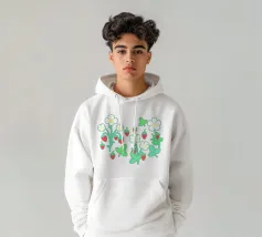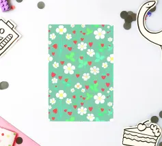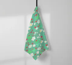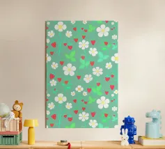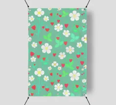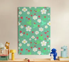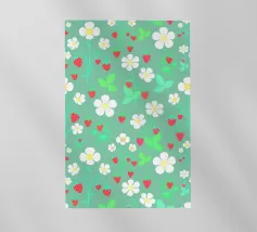 Adorabile stampa floreale con fragole selvatiche rosse con fiori bianchi e steli e foglie verdi, su sfondo verde salvia.