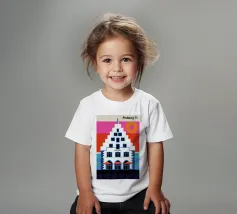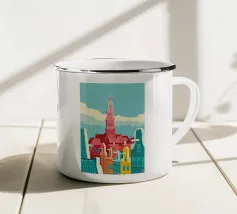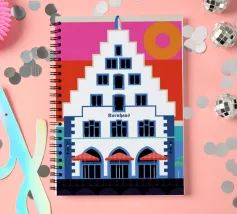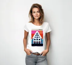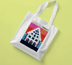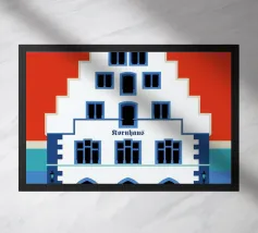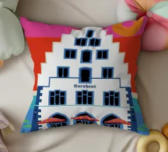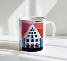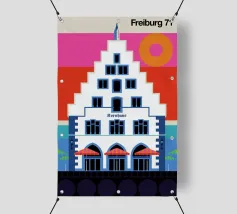 Questa immagine mostra un'interpretazione vivace e moderna dell'iconico edificio Kornhaus di Friburgo. Ideale per gli appassionati di architettura o per chiunque apprezzi l'arte unica ispirata alla città.