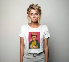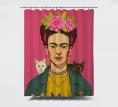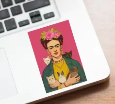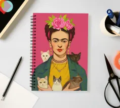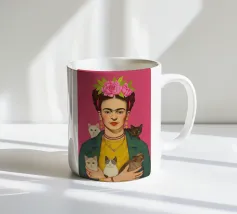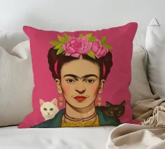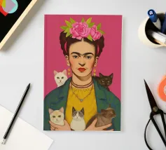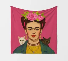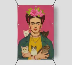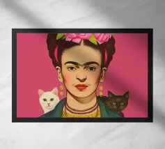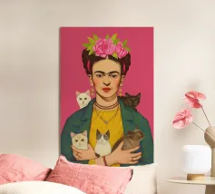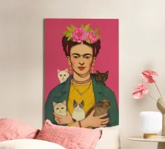 Questo vibrante ritratto di Frida Kahlo la ritrae con una corona di fiori e i suoi amati gattini, e incarna la combinazione di spirito femminista e arte messicana in sfumature rosa e moderne.