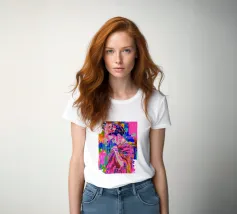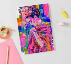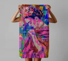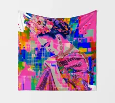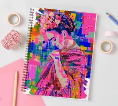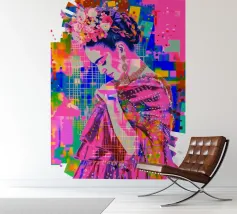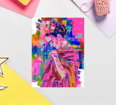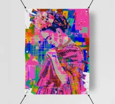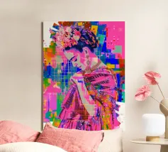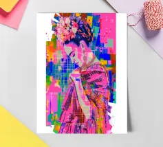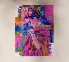 Questo vibrante e colorato ritratto di Frida Kahlo combina pop art e post-impressionismo in una composizione unica. Con colori al neon e audaci elementi grafici, cattura l'essenza della cultura e del folklore messicano in modo moderno.