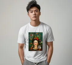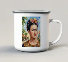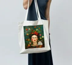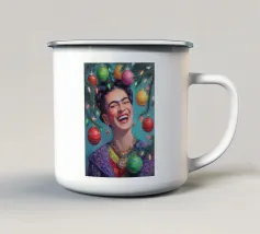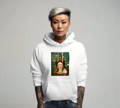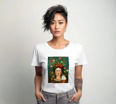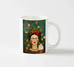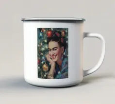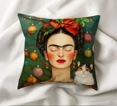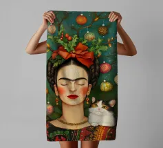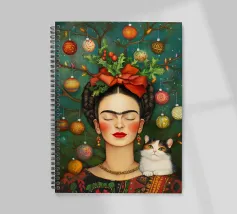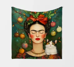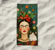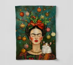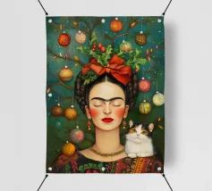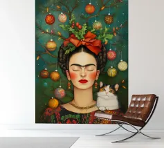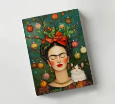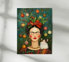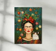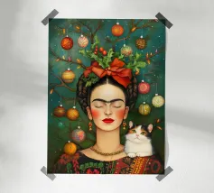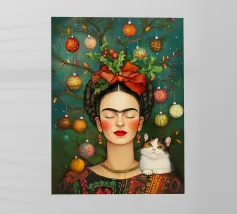 Frida Kahlo, con un simpatico gatto sulla spalla, irradia spirito natalizio. Circondata da luci fiabesche e bacche rosse, il suo ritratto porta un calore festoso tra fiocchi di neve e abeti. Le labbra rosse e il dettaglio del fiocco dei capelli conferiscono all'immagine un tocco affascinante e nostalgico.