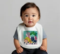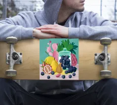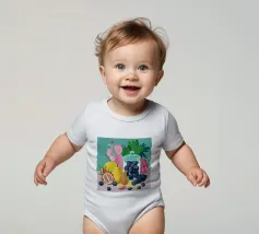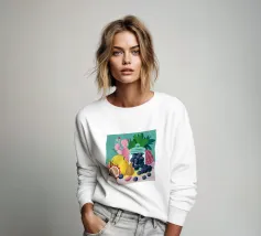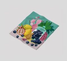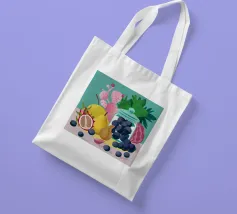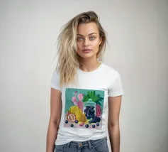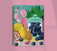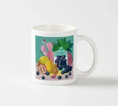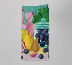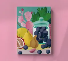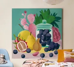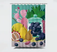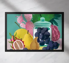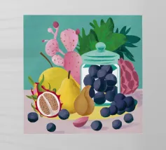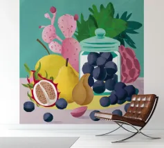 Una rigogliosa composizione di still life di vari frutti come pere, uva e frutti della passione, con cactus e un vaso di vetro, su un ricco sfondo verde acqua.