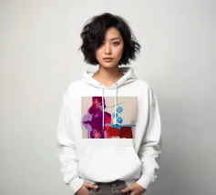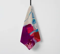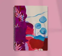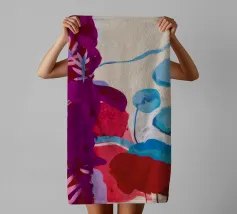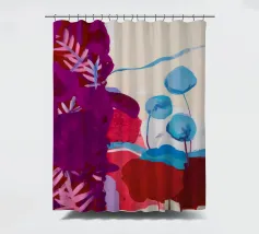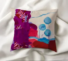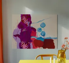 Un audace pezzo floreale astratto con vibranti forme a foglia o a petalo fucsia e viola, accentuate da fiori circolari blu brillante" su steli sottili.