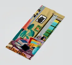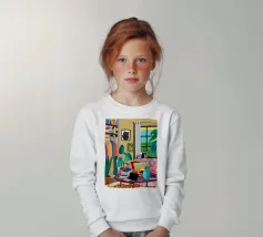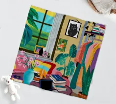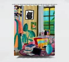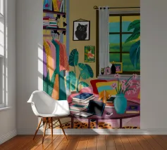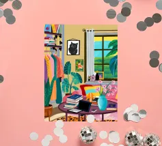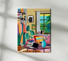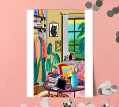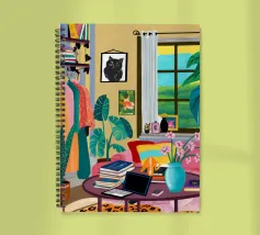 Una stanza vivace, in stile bohémien, piena di piante, libri e mobili eclettici, con una finestra che si affaccia su un paesaggio verde e rigoglioso. La scena è una perfetta fuga creativa in un mondo di comfort e immaginazione.