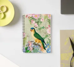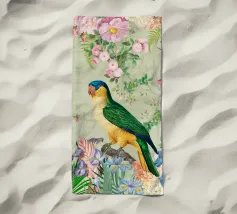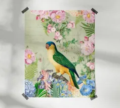 Questo collage vintage è ricco di colori tropicali e di un fascino senza tempo. Al centro, uno splendido cacatua nei toni del giallo e del verde si erge orgoglioso, con i suoi petali esotici che creano un punto focale di grande effetto. Attorno ad esso si trovano vivaci fiori tropicali e rose rosa, i cui colori vivaci esaltano la scena lussureggiante e vivace. Lo sfondo è caratterizzato da una mappa sbiadita, che aggiunge un senso di nostalgia e avventura. La combinazione della bellezza della natura e degli elementi vintage crea una composizione dinamica ma tranquilla, che invita l'osservatore in un mondo di esplorazione e serenità tropicale.