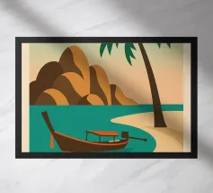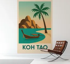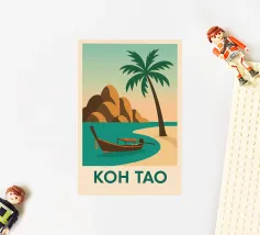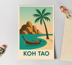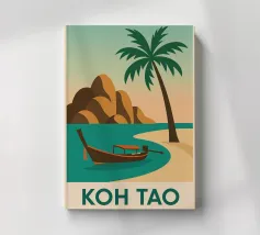 Esplorate Koh Tao in un'incantevole atmosfera vintage. Questo poster minimalista dai colori caldi cattura l'essenza di un paradiso perduto: una spiaggia di sabbia fine, una barca tradizionale a coda lunga, palme da cocco appoggiate e un tramonto pastello. Un invito a immergersi nello stile di vita thailandese. Perfetto per trasformare una parete bianca in un angolo di assoluta evasione.
