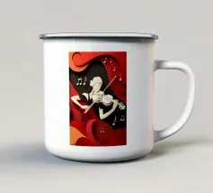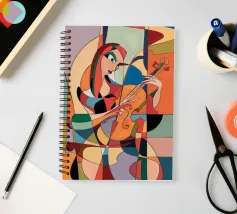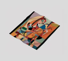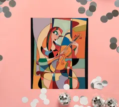 Una violinista resa in vivaci frammenti cubisti suona appassionatamente. La sua figura vibrante è integrata in uno sfondo prismatico di toni caldi e freddi.