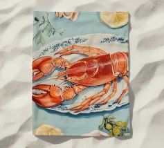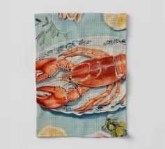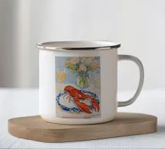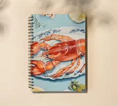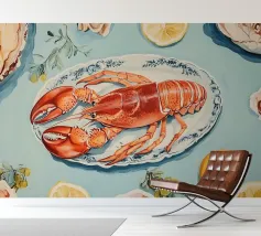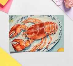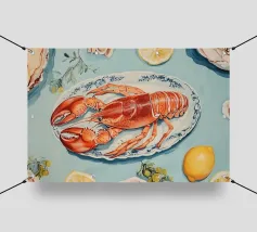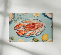 Un dipinto vibrante e dettagliato che mostra un decadente piatto di aragosta, circondato da elementi complementari come un bicchiere di vino bianco e fette di limone. Il dipinto cattura l'aspetto ricco e strutturato dell'aragosta e invita lo spettatore a immaginare i sapori e gli aromi di questa indulgente scena culinaria.