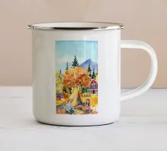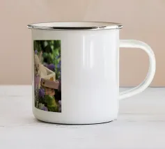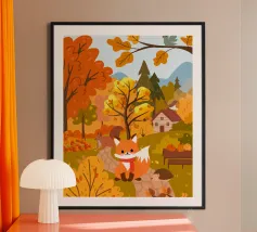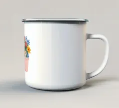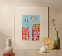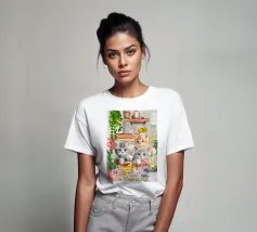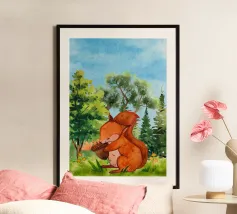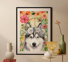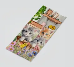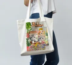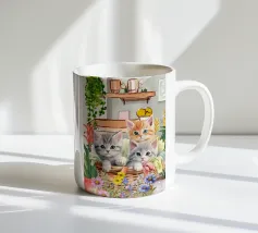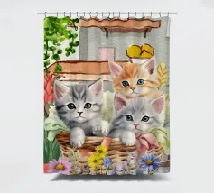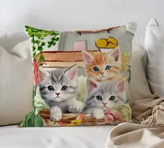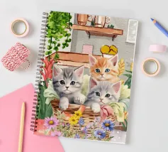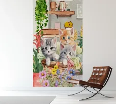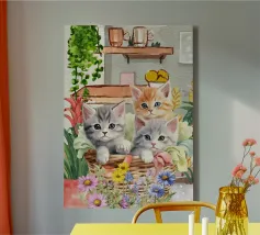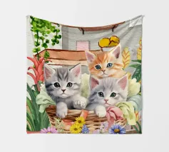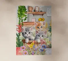 Questo acquerello raffigura tre adorabili gattini accoccolati in un cesto intrecciato circondato da fiori colorati e da una vegetazione rigogliosa. Due gattini sono caratterizzati da una marcatura soriana grigia, mentre il terzo è un soriano rosso. Il cesto è riempito di morbido tessuto bianco e il primo piano è ornato da margherite e altri fiori di campo nei toni del viola, del giallo e del blu.