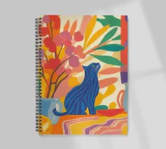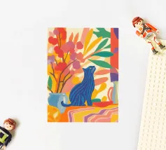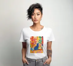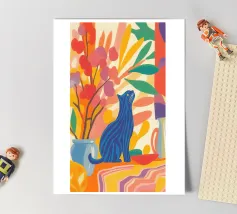 Un gatto a strisce siede in una colorata composizione astratta di fiori e piante, ispirata a Henri Matisse. Questa vibrante rappresentazione celebra la gioia e la creatività del regno animale.