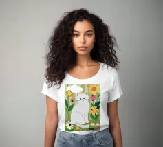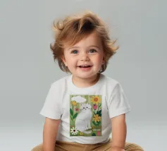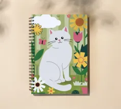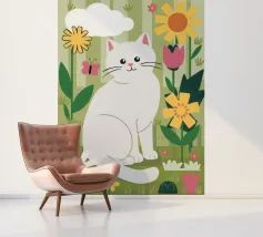 Ritratto di un gatto bianco sereno con occhi espressivi, seduto con grazia in un campo di margherite e altri fiori sotto un cielo nuvoloso.