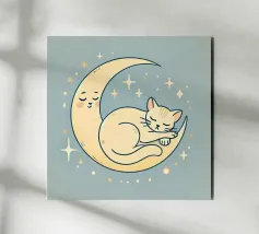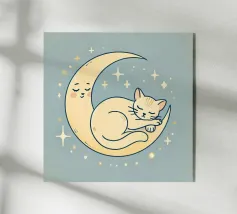 Questo poster minimalista di un gatto che dorme porterà pace e intimità nella stanza del vostro bambino. Il simpatico gatto dorme pacificamente su una mezzaluna dolcemente sorridente ed è dipinto in tenui colori pastello. Il design in stile scandinavo è caratterizzato da linee pulite e forme semplici e crea un'atmosfera rilassante. Questo murale dal design amorevole è perfetto per il bambino ed è ideale come regalo per una nascita o un battesimo, o semplicemente come decorazione elegante per la vostra casa.