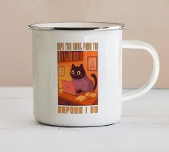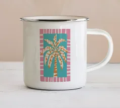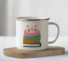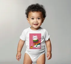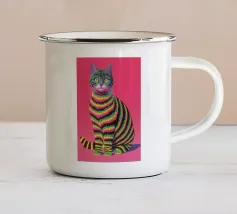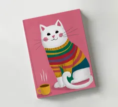 Un affascinante gatto bianco con gli occhi azzurri indossa un maglione a righe colorate in un arcobaleno di colori: rosso, arancione, giallo, verde e blu. È seduto accanto a una tazza da tè gialla, su uno sfondo rosa.