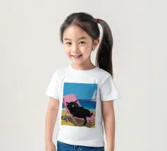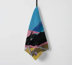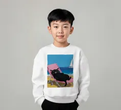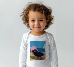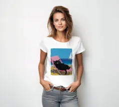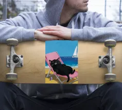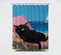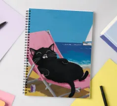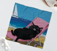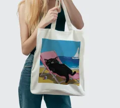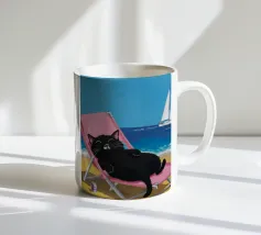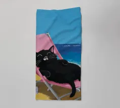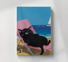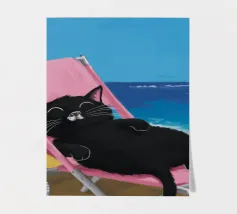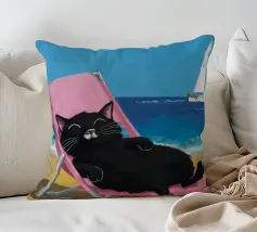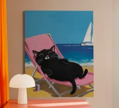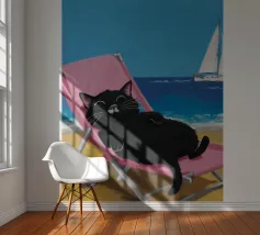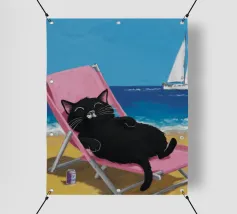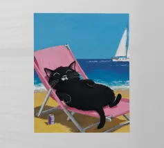 Un gatto nero si sdraia su una sedia da spiaggia rosa sotto un ombrellone, con una barca a vela sul mare sullo sfondo. La scena è una rappresentazione umoristica, elegante e idilliaca di un gatto che si gode una perfetta vacanza al mare.