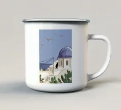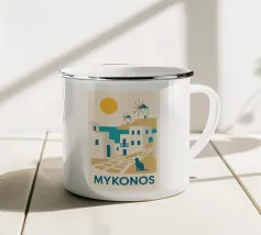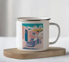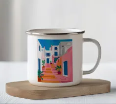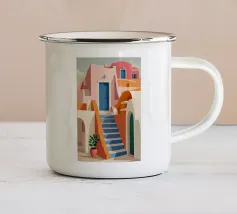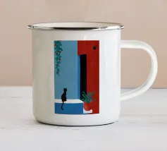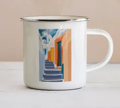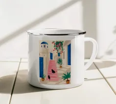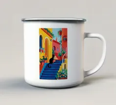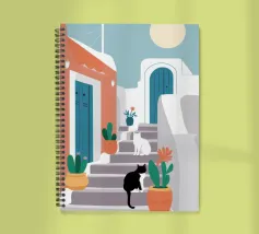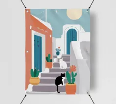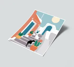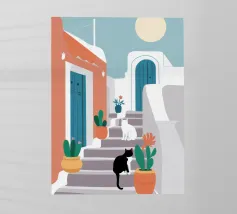Un'affascinante illustrazione di un gatto nero seduto sui gradini assolati di una stradina di una città mediterranea imbiancata. La scena cattura un momento pacifico e iconico della vita quotidiana in una splendida località.