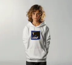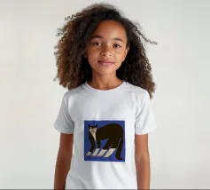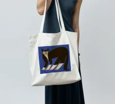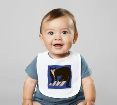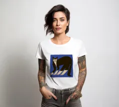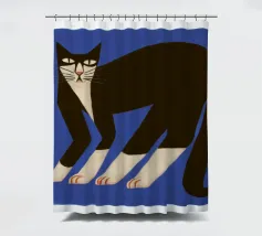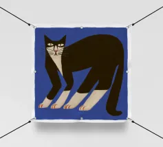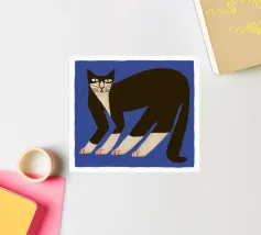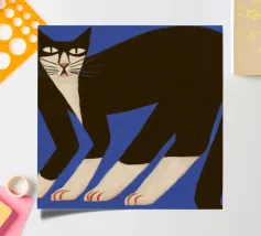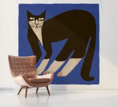 Un'illustrazione di un gatto nero con zampe e petto bianchi, catturato in una posa dinamica e leggermente arcuata su un quadrato blu in grassetto su uno sfondo più chiaro, che suggerisce una caccia di mezzanotte o una posizione curiosa.