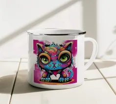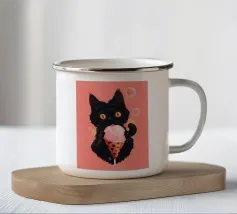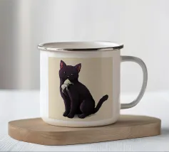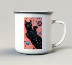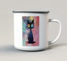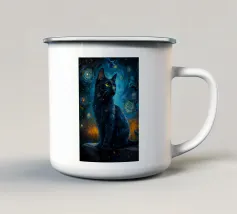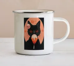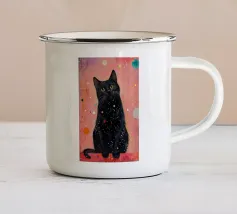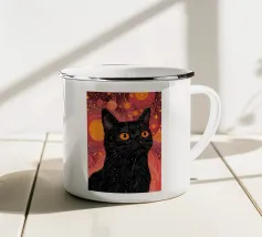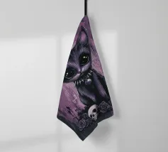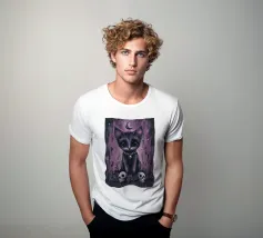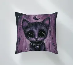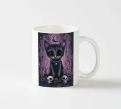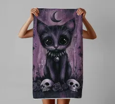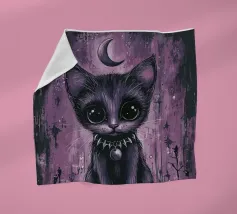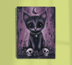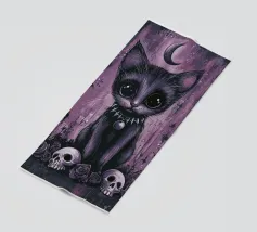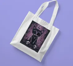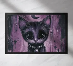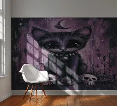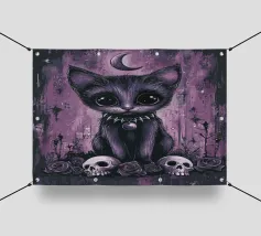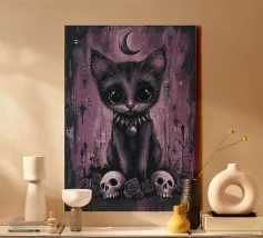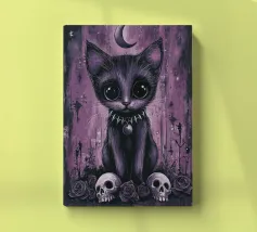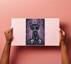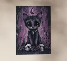 Questa affascinante illustrazione mostra un misterioso gatto nero con grandi occhi luminosi seduto in un ambiente surreale dalle tinte viola. Una luna crescente aleggia sopra di lei, sottolineando l'atmosfera mistica della scena. Il gatto indossa un vistoso collare con spine e un campanello, mentre è circondato da rose e teschi. La combinazione di toni viola intensi, nero a contrasto e dettagli raffinati crea un'atmosfera cupa ma giocosa, mistica e leggermente gotica. Quest'opera d'arte è ideale per gli amanti di