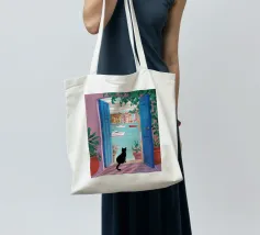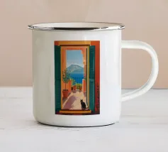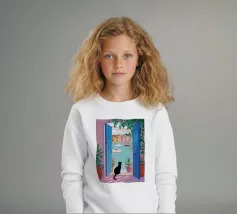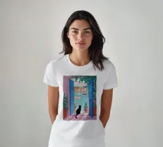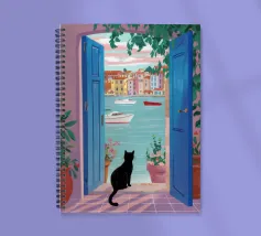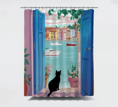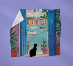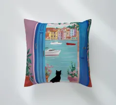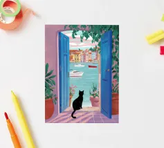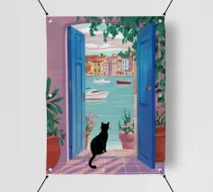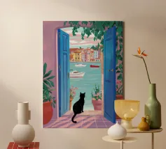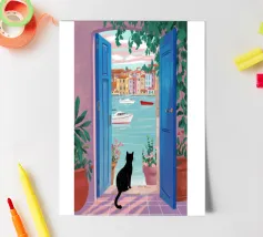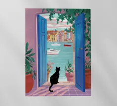 Una veduta dall'interno di una stanza, che guarda attraverso una porta blu aperta verso un bellissimo porto illuminato dal sole con una barca. Un gatto nero sta per uscire, aggiungendo un tocco di narrazione affascinante alla scena idilliaca.