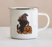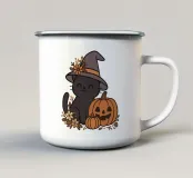 Adorabile gatto nero con cappello da strega, circondato da zucche, funghi e fiori autunnali nei caldi toni del giallo e del marrone. Perfetto disegno di Halloween kawaii per adesivi, magliette, borse e regali stagionali. Celebrate la spettrale stagione autunnale con un'illustrazione affascinante e simpatica!