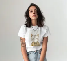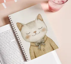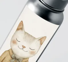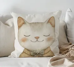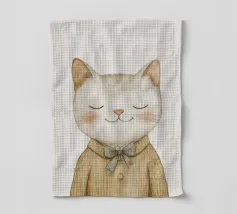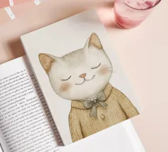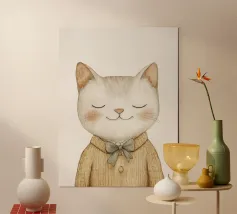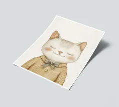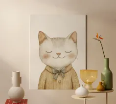 Questa simpatica illustrazione di un piccolo gatto con gli occhi chiusi e un accogliente maglione di lana porterà un tocco di allegria nella stanza di ogni bambino. In morbide tonalità beige pastello e con un design minimalista, celebra l'amore per i simpatici animali ed è perfetta come decorazione murale creativa per i più piccoli.