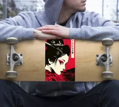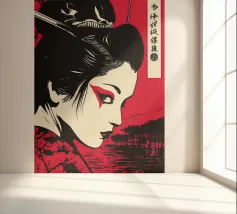 Questa potente reinterpretazione delle classiche stampe giapponesi su blocco di legno combina la tradizione ukiyo-e con l'estetica grafica della pop art moderna. La composizione drammatica in rosso e nero e le linee ridotte ricordano i manga e gli anime, mentre la calligrafia autentica aggiunge profondità culturale. L'intenso ritratto irradia un'eleganza senza tempo e trasforma qualsiasi ambiente in un tributo alla tradizione artistica giapponese con un tocco contemporaneo e di tendenza.