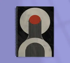 Una composizione geometrica presenta un grande cerchio intersecato da linee verticali, sormontato da un audace cerchio rosso. Gli elementi monocromatici contrastano con uno sfondo scuro e vorticoso.